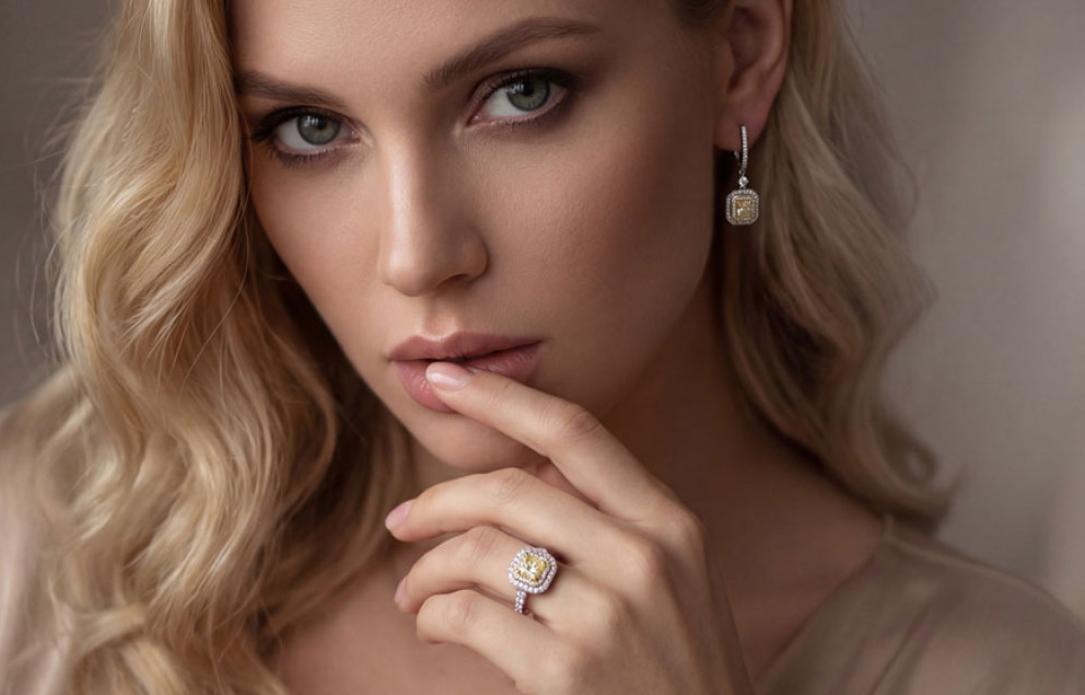 В её центре - жёлтый бриллиант. Редкий и притягательный, он словно хранит в себе тёплый луч, пойманный в движении.