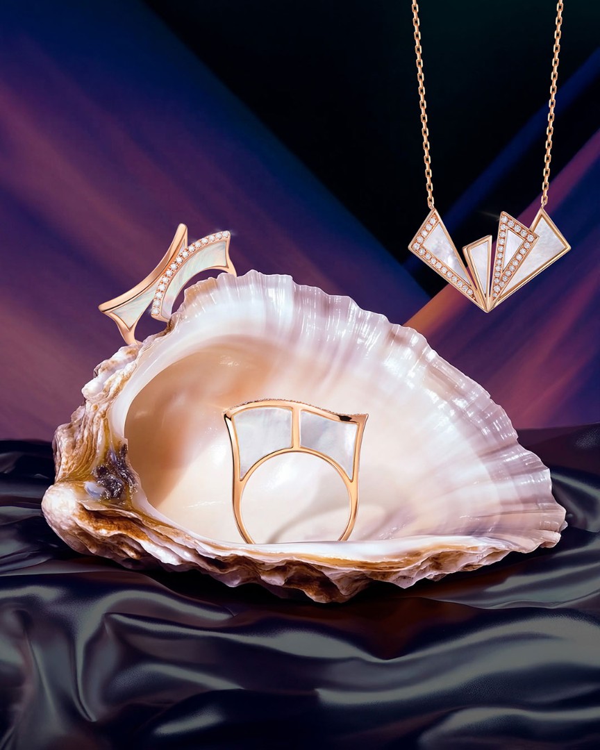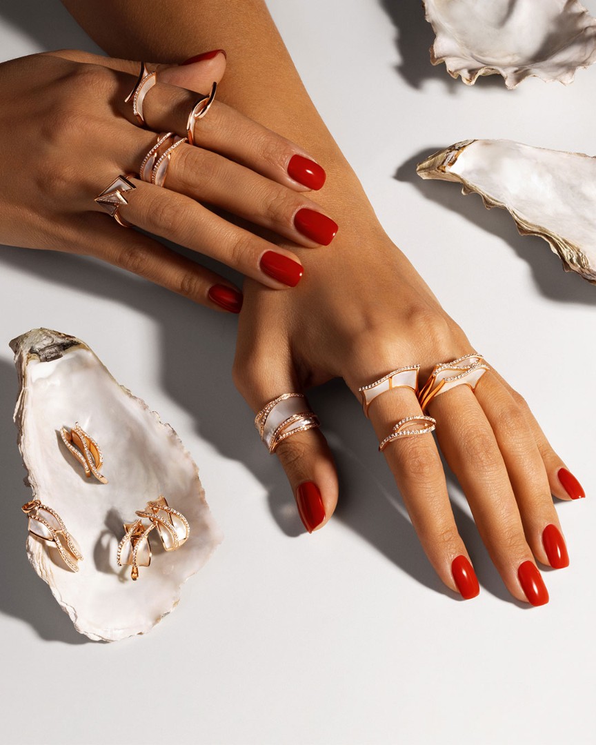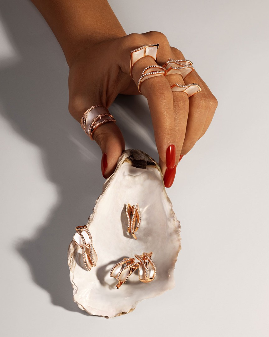 Коллекция «Aurelia» — это синергия природы и высокого ювелирного искусства. Она выполнена с использованием перламутра, облаченного в розовое золото и дополненного бриллиантами. Форма украшений, напоминающая извивающуюся волну, устремляющуюся к вечности, символизирует непрерывность времени и вечную красоту.