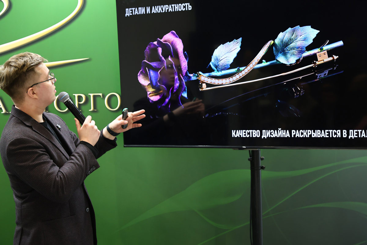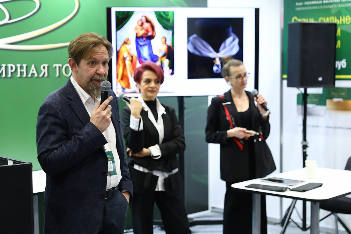 В формате «Ювелирного баттла» сошлись мнения прагматика и эстета. Олег Смирнов (GRANT) показывал, как увеличить оборачиваемость бриллиантовой витрины, а историк моды Юлия Галич-Кириллова — как продавать эмоции и «вечное» за 30 секунд.