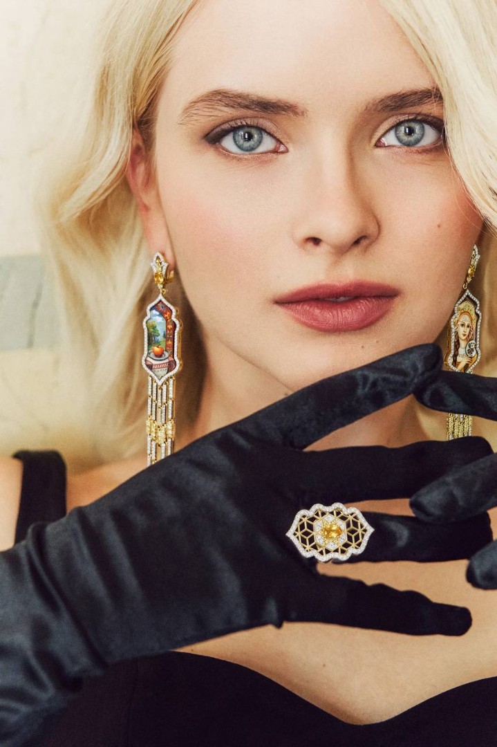 Для фотосессии были выбраны украшения из эксклюзивной золотой коллекции Kabarovsky «Сказки Пушкина». В этой коллекции, уже знакомой ценителям, оживают образы, знакомые с детства, но раскрытые по-новому — через язык ювелирного искусства. Изделия выполнены из золота 585 пробы с бриллиантами, изумрудами, жёлтыми сапфирами, жемчугом и расписной финифтью.