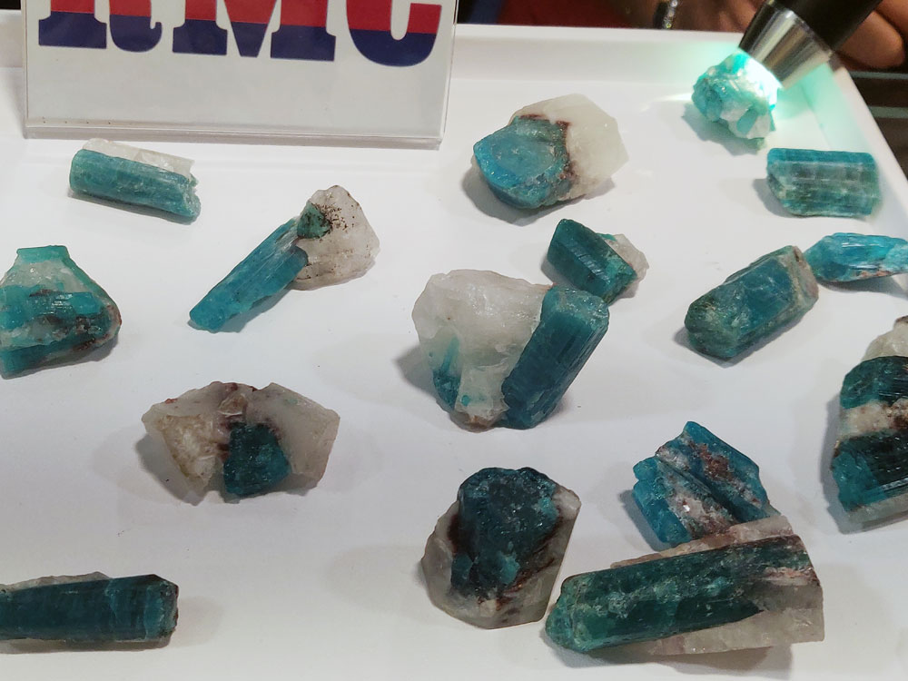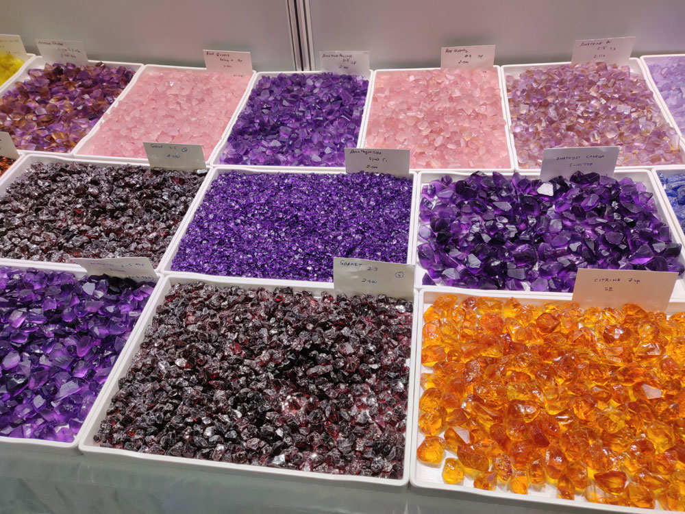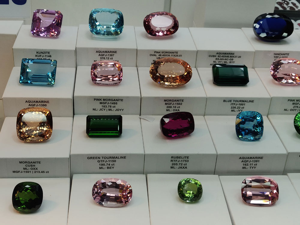 Необходимо отметить, что хотя выставка была ориентирована на экспонирование как обработанных ювелирных камней, так и сырьевых, последних экспонировалось заметно меньше. Ряд ювелирных камней были представлены на выставке в сырьевом виде и ювелирном качестве в достаточном изобилии. Это кварц (аметист, цитрин, дымчатый и розовый кварц), от бесцветного до синего топаз, берилл (аквамарин, гелиодор, морганит), турмалин, гранат (тсаворит, родолит, спессартин), кунцит, танзанит.