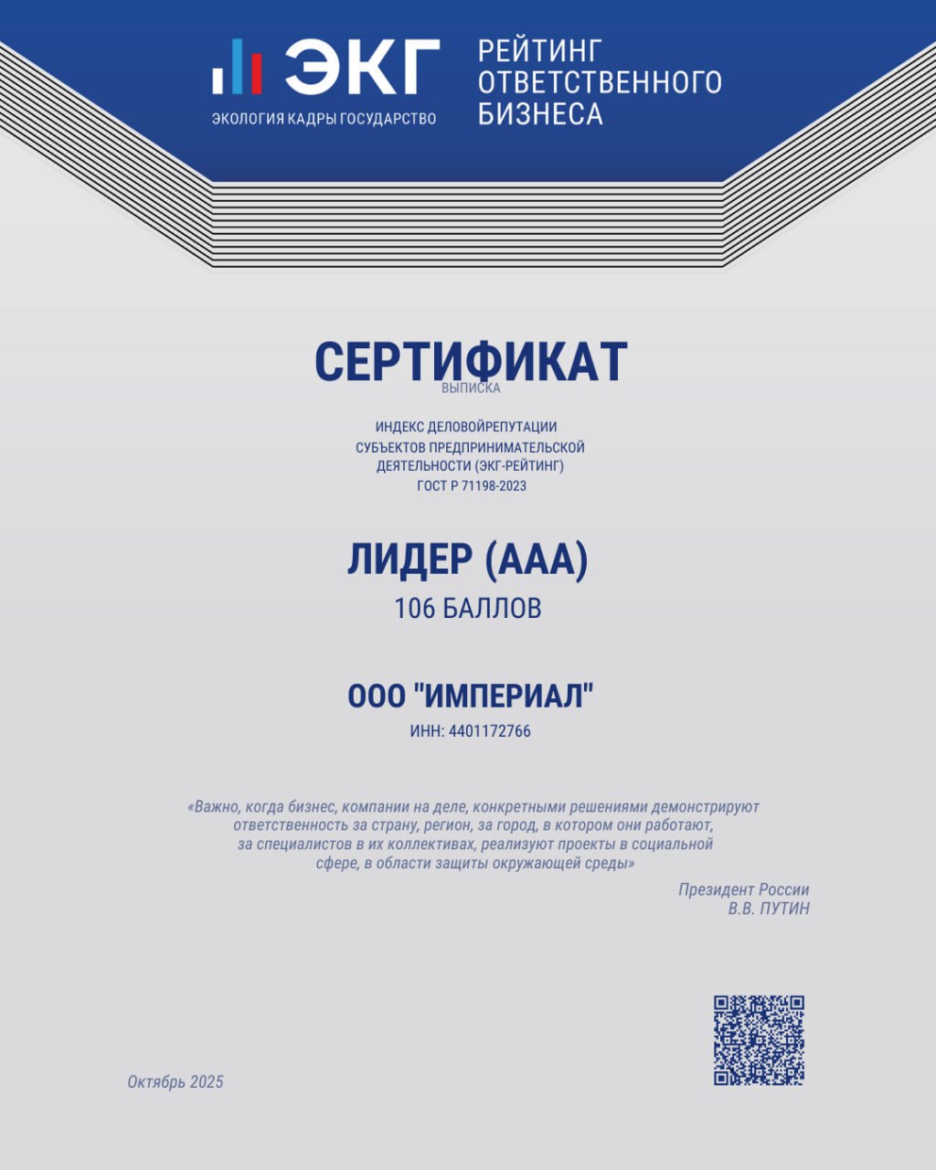 Компания "Империал" получила высшую оценку надежности — ЭКГ-рейтинг «Лидер (AAA)».