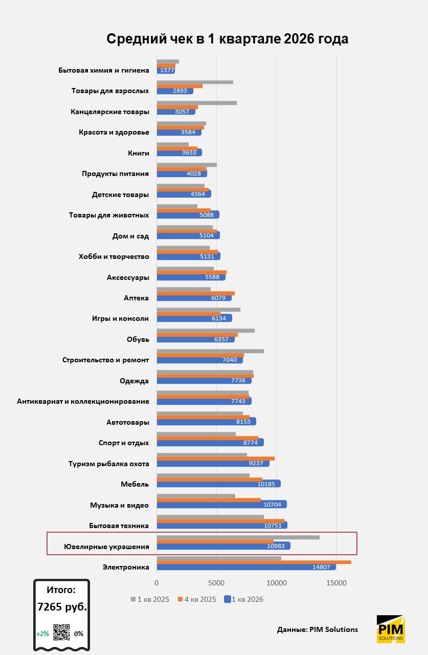 Общий средний чек практически не изменился: разница с прошлым годом составила всего 2%, результат прошлого квартала повторился точь-в-точь. Многие категории серьезно просели в среднем чеке. Наиболее заметно показатель снизился у товаров для взрослых и канцелярских товаров: за год их средний чек снизился практически в 2 раза. Также серьезно пострадали обувь и товары для строительства и ремонта. Продавцы ювелирных украшений нарастили средний чек по сравнению с прошлым кварталом, но серьезно сбавили по сравнению с прошлым годом. У продавцов электроники ситуация противоположная. Заметно увеличить средний чек как в годовом, так и в квартальном выражении удалось продавцам мебели, а также музыки и видео.