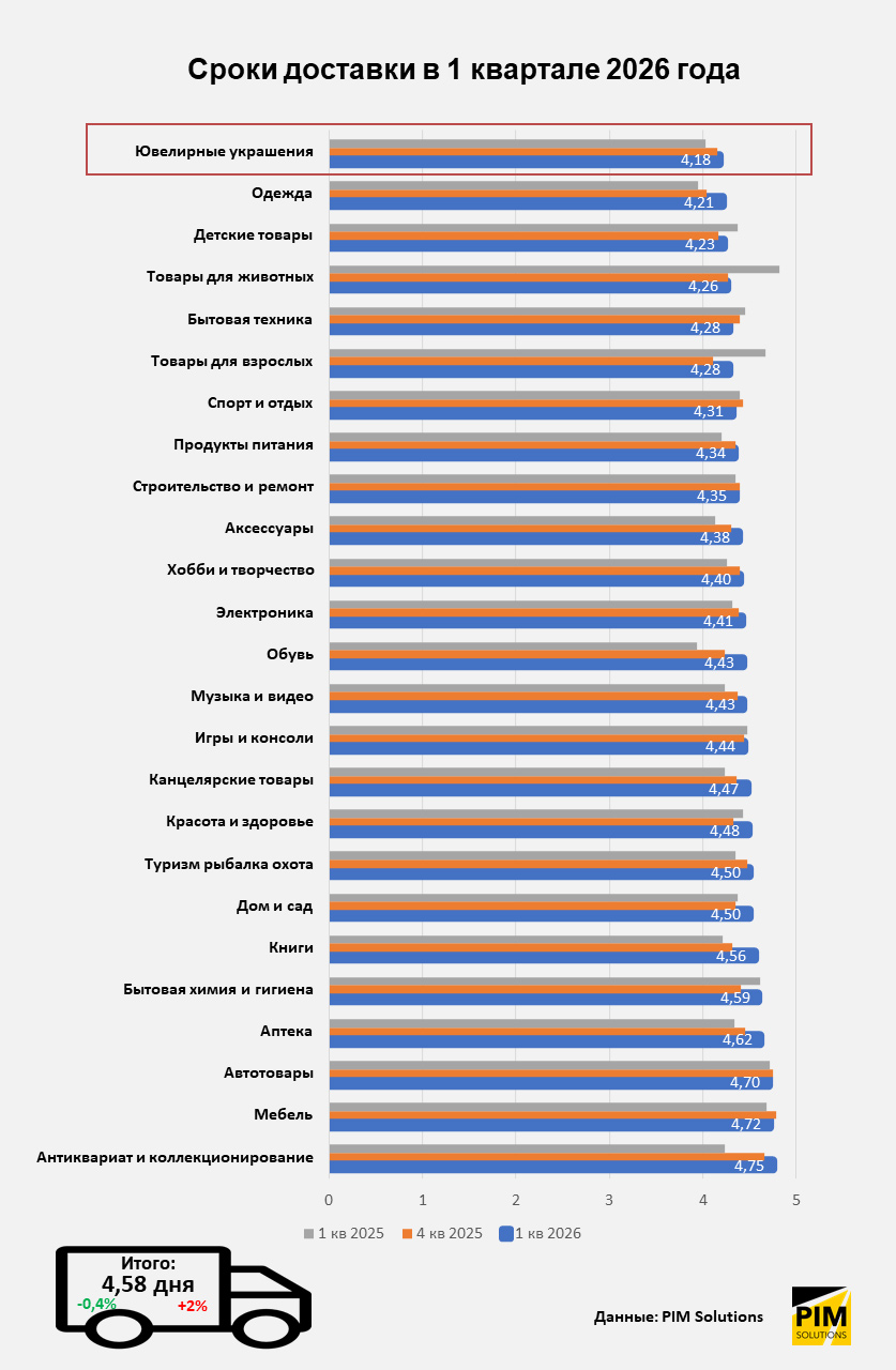 Благодаря отличной работе курьерских служб сроки доставки остаются самой стабильной метрикой, в прошлом квартале они тоже практически не изменились. Разница между первым и последним местом составляет чуть больше половины дня, так что можно сказать, что все товары доставляются плюс-минус в одни и те же сроки. При этом стоит указать на то, что во многих категориях сроки доставки подросли — это хорошо видно на графике. В абсолютных значениях это, конечно, совсем мизерные показатели, но они сигнализируют о том, что гонки за скоростью доставки остались позади.