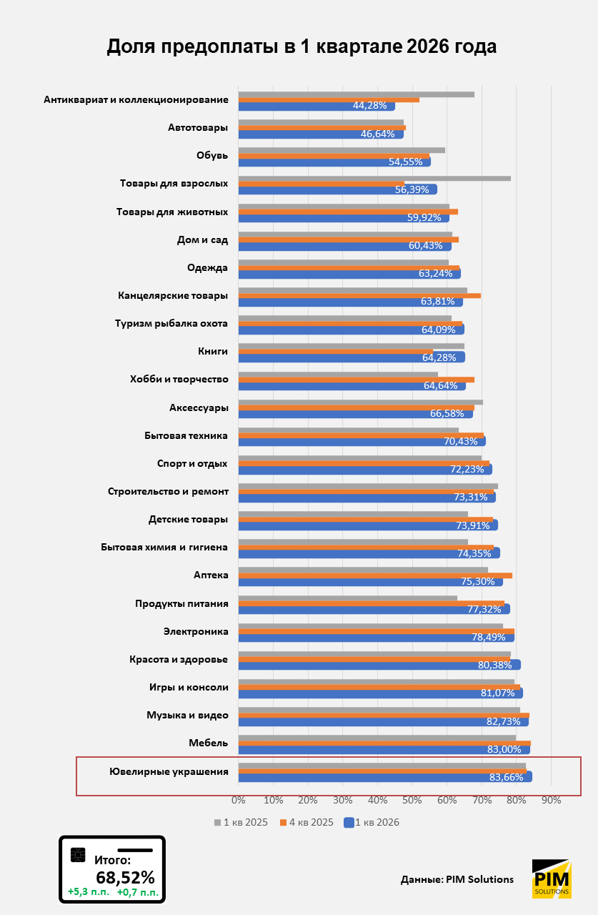 Средняя доля предоплаченных заказов по всем товарам составила 68,5%, что заметно выше предыдущих значений, особенно прошлогодних. Заметнее всего драматичное снижение доли предоплаченных заказов в категориях антиквариата и товаров для взрослых, причем первая снизила результат как за год, так и за квартал. При этом большинству категорий, хотя и ненамного, но все же удалось нарастить долю предоплаты, благодаря чему общий результат оказался положительным.