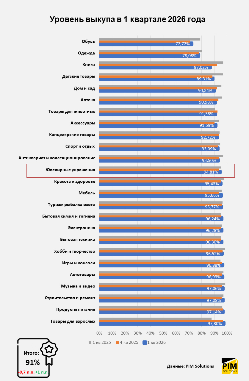 Средний выкуп по всем категориям составил ровно 91%, что хуже чем прошлогодний результат, зато на целый процент выше результатов распродажного 4 квартала прошлого года. Заметнее всего он упал в категории книг, по сравнению с прошлым годом есть проседание у обуви, детских товаров, лекарств и товаров для дома и сада. А вот по сравнению с прошлым кварталом большинство категорий, хотя и не очень сильно, но все же улучшили свои результаты.