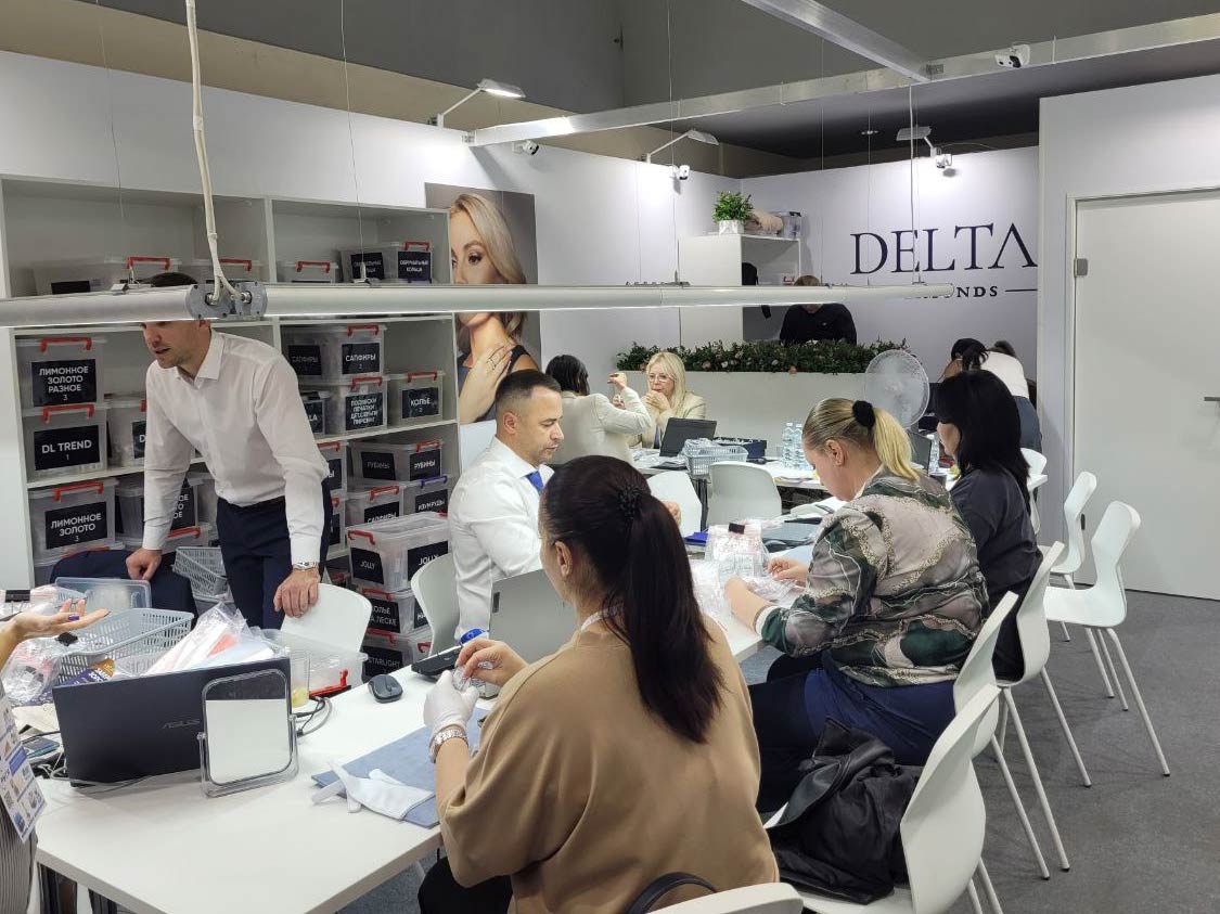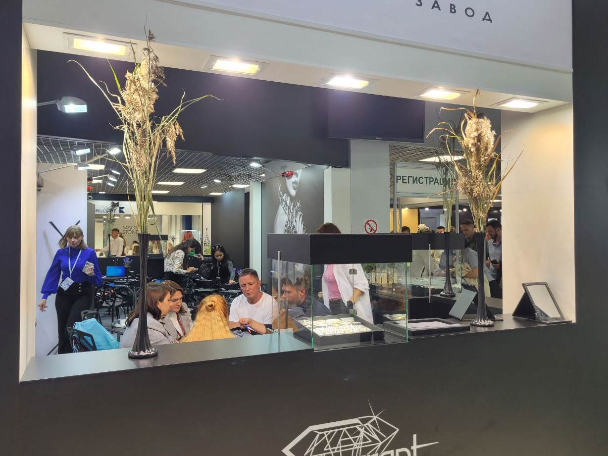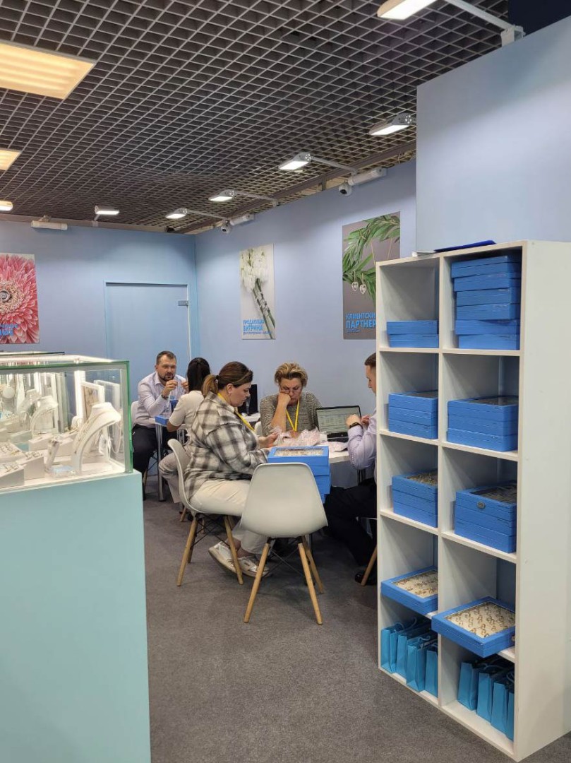 Прогуляемся по 55 павильону? Это та самая мекка для оптовиков, где уже ведут отборки украшений представители магазинов со всей России. Традиционно оптовый раздел начинает работу на день раньше, еще до официального открытия выставки, пока 57 и 33 павильоны завершают подготовку стендов. Почти у всех компаний - полная рассадка, и гости продолжают прибывать.