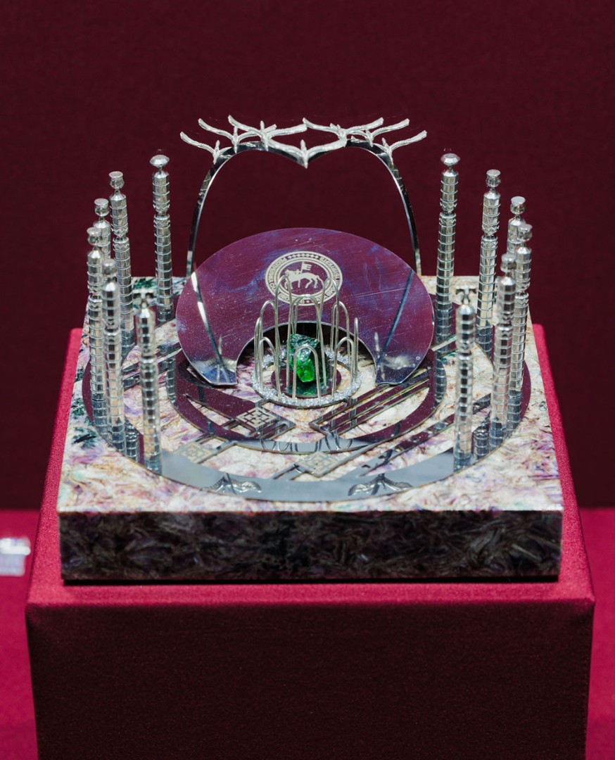 Особая гордость в этом году — сувенир «Площадь Республики». Это изделие из серебра, инкрустированное бриллиантами, хромдиопсидами и чароитом, посвященное главной площади Якутии.