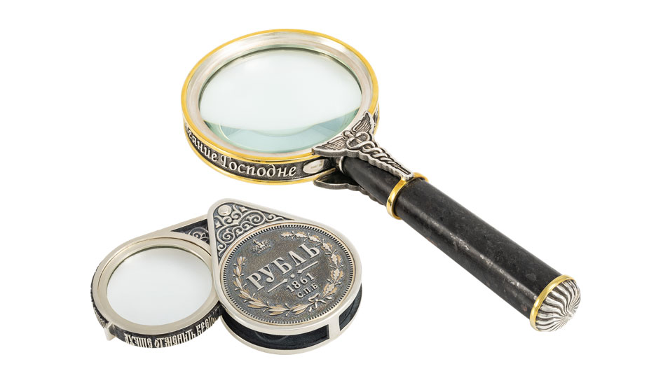 Увеличительное стекло «Рубль», увеличительное стекло «Врачебный талант»