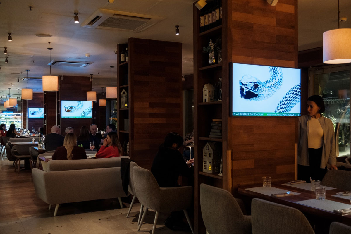 В самый разгар подготовки в Новому году рекламное агентство JUNWEX усиливает рекламную кампанию февральской выставки в сети Ginza. Праздничное время — это особый период, когда рестораны и кафе полны гостей, и реклама становится особенно заметной.