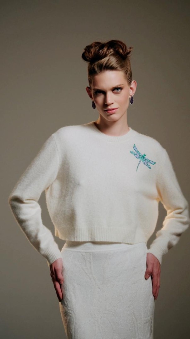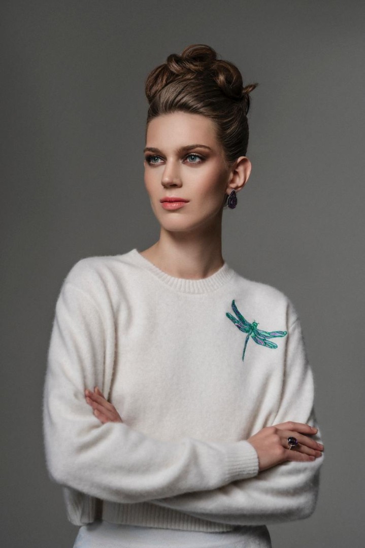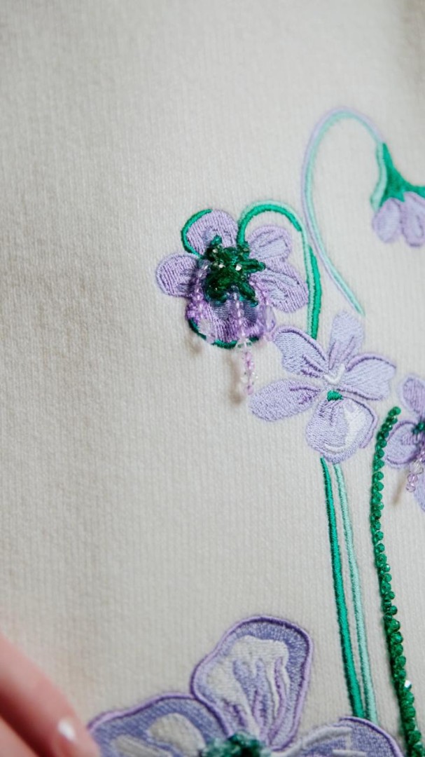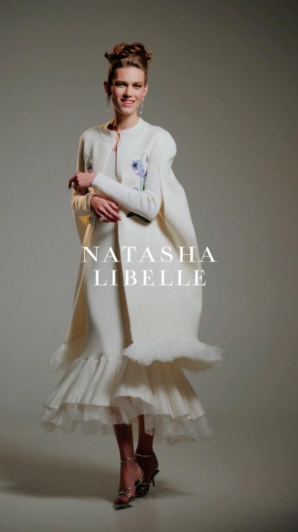 Центральным акцентом коллекции стал нежный цветок фиалки, изображенный на белоснежных полотнах кардигана и кейпа. Фиалка — элемент бренда Natasha Libelle и символ любви и удачи с богатой историей, уходящей корнями в мифологию. Она символизирует надежду и возрождение, напоминая, что даже в трудные времена можно найти красоту.