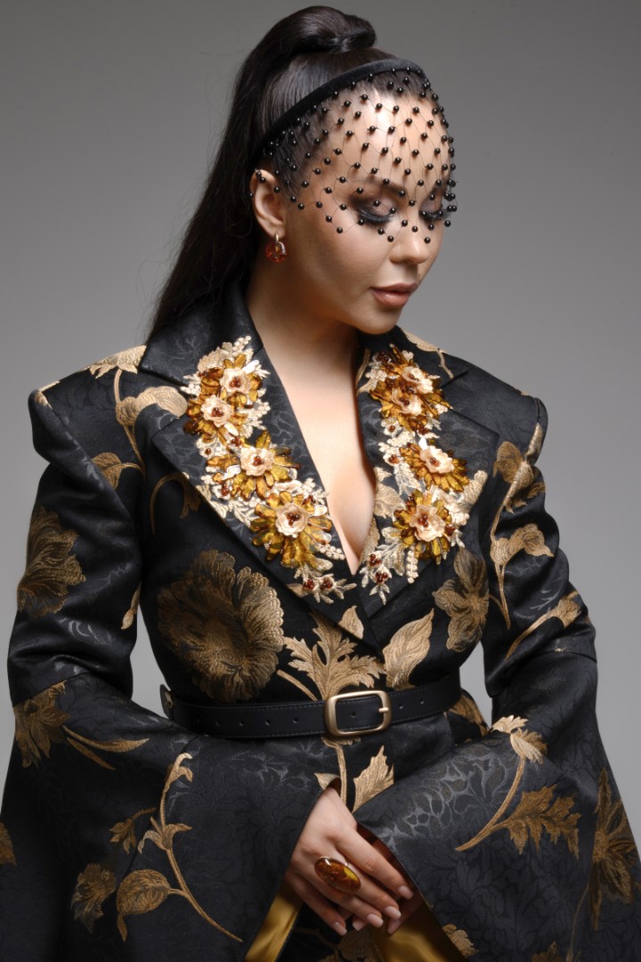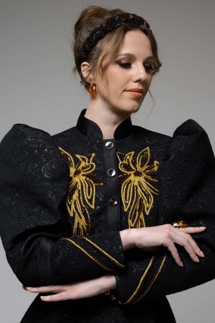 Центральным образом коллекции стало уникальное вечернее платье. Для его создания потребовалось 1300 янтарных элементов. Все детали закреплены на ткани вручную. Работа над платьем продолжалась более ста часов.