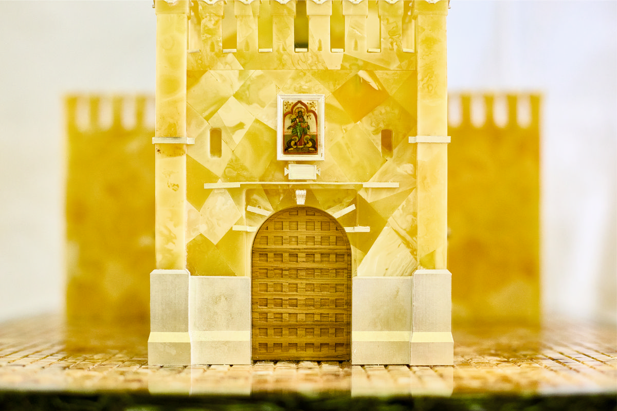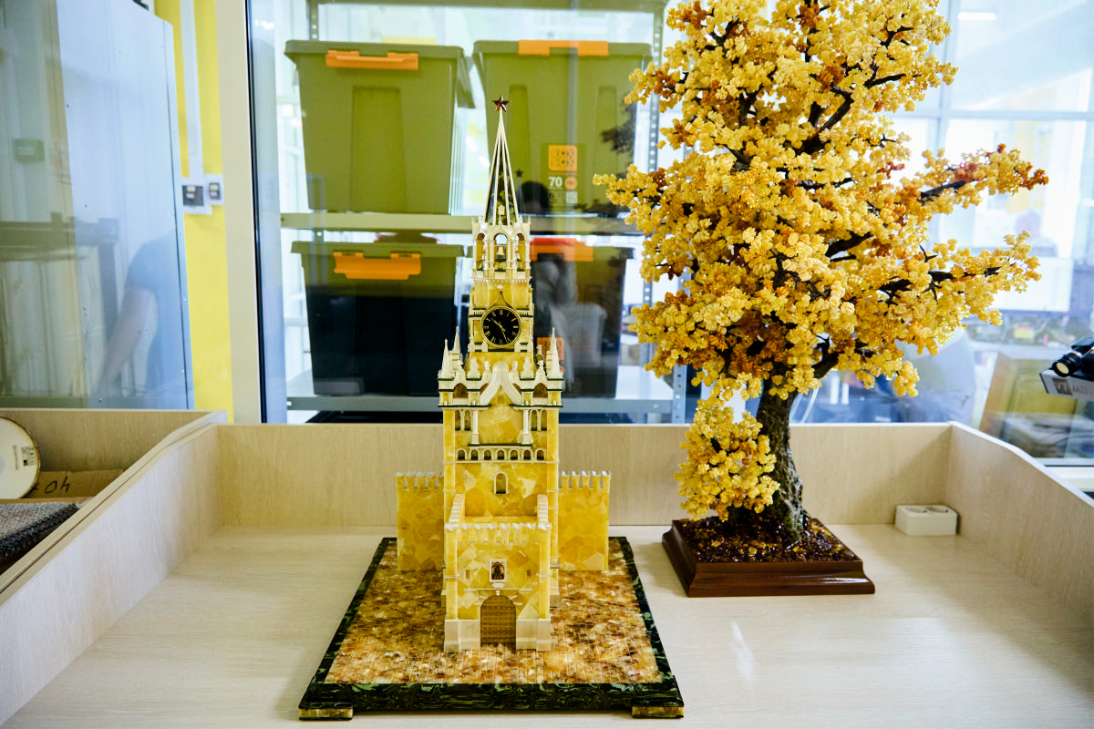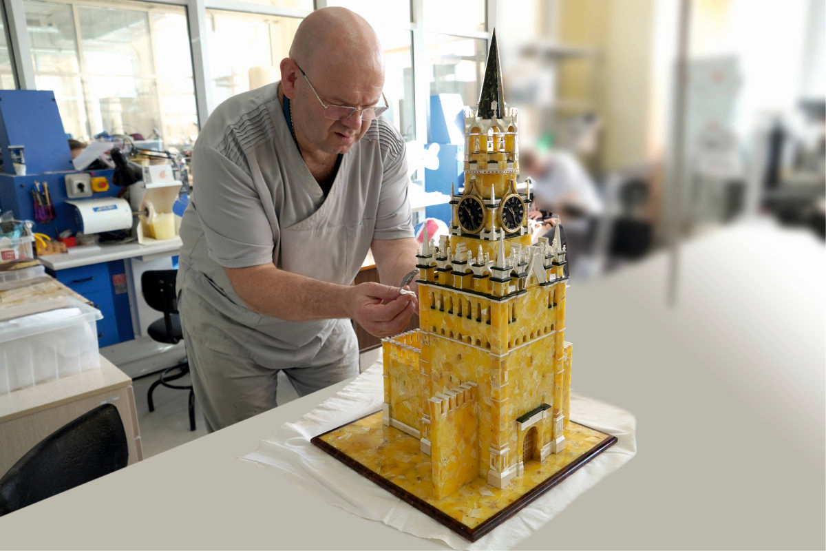 Миниатюрная версия главной башни Московского Кремля выполнена в технике мозаики. Каждый фрагмент был предварительно обработан и подогнан под соседний вручную. Для создания башни потребовалось пять месяцев и 17 кг первосортного матового янтаря.