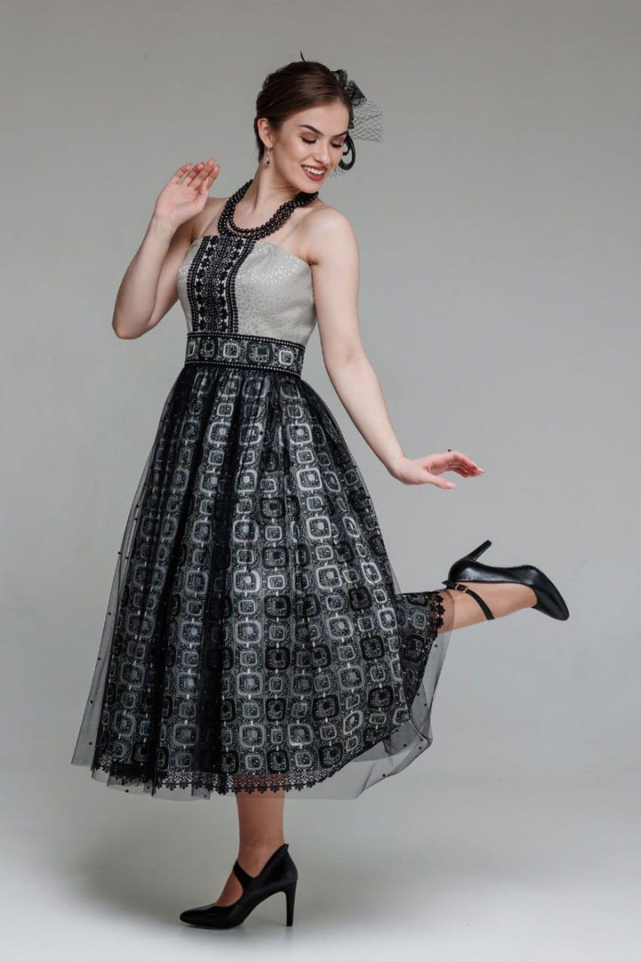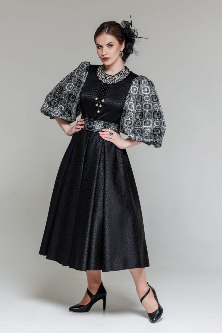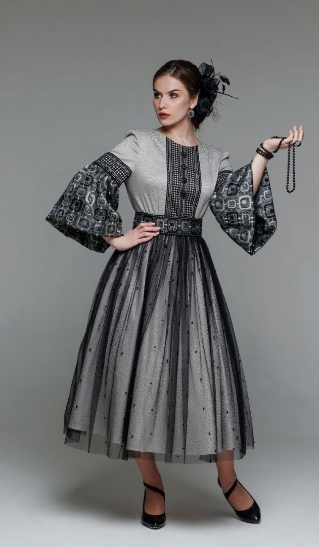 Коллекция выполнена в черно-серой гамме, которая является основным цветом природного камня, с использованием жаккардовых тканей, кружева, фатина - декорированного черными бусинами, отделкой в виде страз, которые придают изысканность и элегантность декору на платьях. Изысканность коллекции придают ювелирные украшения из натурального камня.